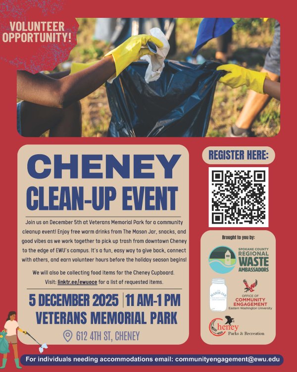 Join us December 5th from 11-1pm for a community clean-up event. Enjoy free warm drinks from the Mason Jar, snacks, and good vibes as we work together to pick up trash from downtown Cheney to the edge of the EWU campus.