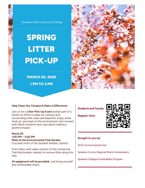 Join us for a community litter clean-up event at Spokane Falls Community College on Friday, March 20th from 1-3pm. We will email a campus map with parking and meeting spot locations prior to the event. Bags and litter pickers provided.